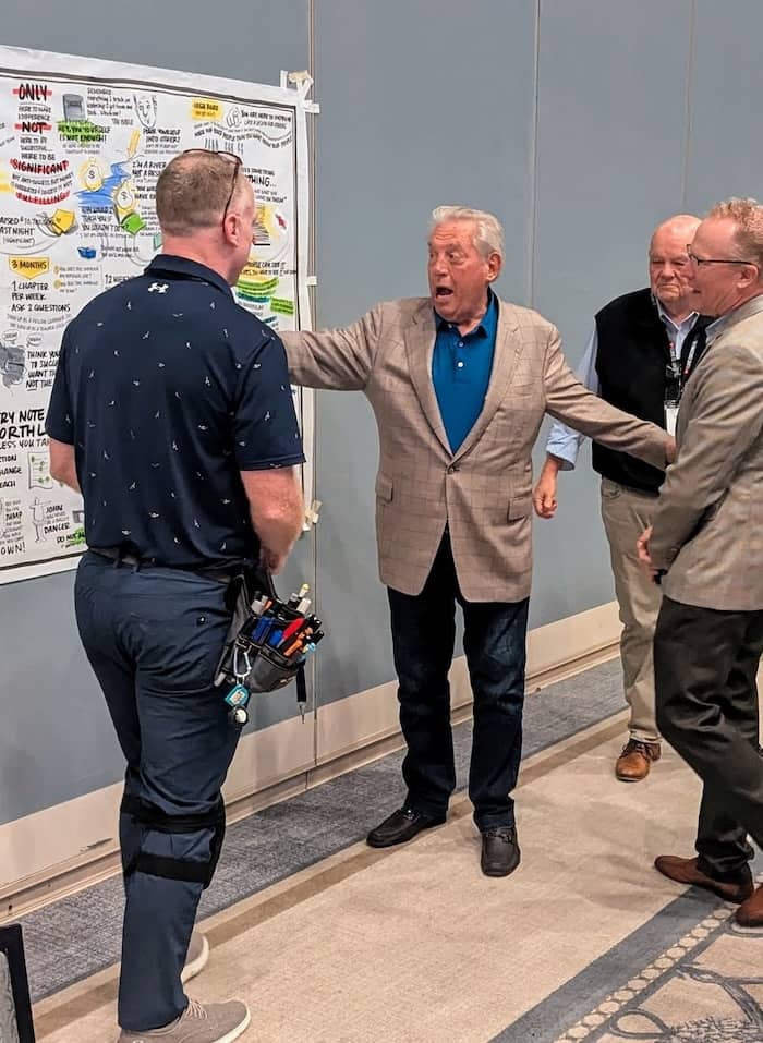 When I finish with a live sketching session, it stinks in there. I don’t mean the drawings stink. I mean that I physically smell not so amazing. I’ve been sweating for hours, holding lunges and squats in positions that let me reach every corner of those massive boards. Moving around on floors. Kneeling on marble stages. By the time I pack up my markers, I can smell myself. And I’m almost surprised every time it happens. This isn’t what people picture when they think about someone drawing cool pictures at live events. But, to me, this is what the work actually requires. The physical demands go beyond just fitness. It’s about mobility, yes, but also about systems. Having the right tools in the right places. Setting up yourself, both you and your workspace, so your body can move efficiently for hours without breaking down. Drawing isn’t a contact sport, but it also isn’t just whipping out some markers and calling it a day, either. The IBM MomentFlash back to years ago, I was drawing at an IBM event. Seventeen markers in my hands at once, trying to switch colors quickly, and capture ideas as they emerged. Markers started falling everywhere. Rolling across the stage. Under tables. Into the crowd. It was a mess. Unprofessional. Distracting. I never wanted to work that way again. So I built a system. A tool belt which holsters my markers, arranged by color family. Muscle memory means I can grab the right marker without looking. No fumbling. No dropping. No interrupting the flow of the session. The gear matters because the work matters. I’ve seen other practitioners use messenger bags full of markers, or lay them out on tables, or hold them between their fingers. For me, those might work fine… until I’m moving fast, covering ground, switching between standing and kneeling positions dozens of times in an hour. Then the system breaks down. Towel Knee PadsLet’s skip to another time when it became clear that the right equipment mattered: four and a half days at a Keller Williams Family Reunion conference in 2023. Twenty thousand people. Nineteen foam boards to fill. The stage was marble. Beautiful to look at, brutal to kneel on. By day two, my knees were destroyed. So I improvised. I texted the stage manager and asked if she could grab me some hotel room towels (don’t tell Marriott), we rubber-banded them around my knees. Made it through the rest of the conference that way. It looked ridiculous, but for the event it worked and it saved my knees. When I got home, I invested in professional knee pads. The kind construction workers use. To me, doing this work seriously, means showing up with the right tools even if I look a little silly running to the bathroom on breaks. Not just for comfort. For endurance. For the ability to hold those positions without my body complaining non-stop before the session ends. The physical preparation matters. Not because it makes me special, but because the work demands it. I’d rather stink than be sore. Training means my legs don’t hurt afterward. Toolbelts make sure I can grab what I need. Kneepads mean I can walk afterwards. What Drawing Looks LikeQuality work has an infrastructure most people never see. For me, it’s tool belts and knee pads. For you, it might be the research done before the pitch. The backup systems that prevent failures. The physical setup that lets you work for hours without breaking down. Every piece of quality work has a supporting cast of decisions, tools, and preparations that never make it into the portfolio. Mine happens to include knee pads and marker holsters (and extra deodorant). Yours probably includes things just as unglamorous, but equally essential. What’s the invisible infrastructure behind your best work? And are you investing in it the way you invest in the visible parts? The sweat isn’t optional. Neither is the system that makes the work sustainable. I might stink, but this is me trying to make sure the work doesn’t. Grateful you are here, Wade |