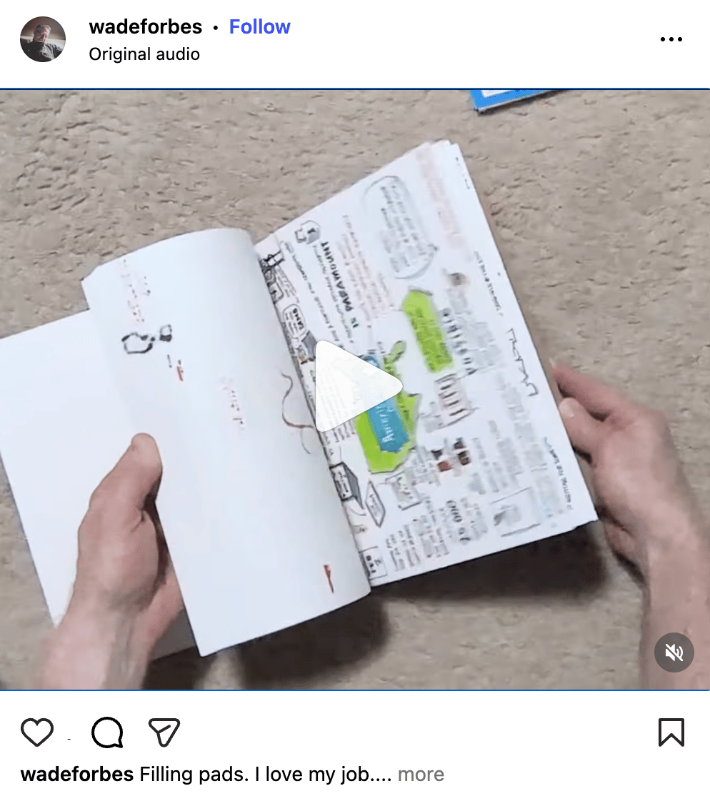 On video calls, I’m always looking down. Is it because I’m distracted? Checking my phone?! Gasp… bored?!?! Nope, nope, and definitely nope, uh-uh, no way. You see the top of my head on a call because I’m leaning down and drawing what you’re saying in real time. There’s a small notebook right in front of me, like always. Pen is in hand. While we talk, I’m making visual notes of the conversation. Maybe what you need, or think you need. What clearly matters to you. The problems you or your team might be trying to solve. But I have to tell you, it wasn’t always part of how I worked with new people. August 2023 I lost 12 bids in a row that summer. 12! In a row. It was clear something had to change. But what? What was I really doing “wrong”? Turns out nothing. Really just needed to involve one more step. I’d been drawing during my calls forever. Sketching out challenges, or things they were looking for, problems they were trying to solve. So many of these visual notes of the conversation. So what was the “big” change? Simple: I’d send the drawings to the person after the call. Sometimes, if I’m feeling extra bold, the pricing for a live visual drawing session appears in the bottom corner. A full image of displaying some form of what you said, what we can do, and what happens next. And like snap-your-fingers-magic, the number of live sessions went up. Sales-y sales folk call these discovery calls. People call wondering about your services or think you might be able to help them. And some of you might know that many discovery calls feel transactional. Someone asks questions, takes notes you’ll never see, promises to follow up. Our talks are different because a few hours after we hang up, there’s a drawing in your inbox. What you said, in sketch form. It’s something close to proof that the conversation mattered. That someone absorbed what you were actually trying to communicate, not just what questions they needed answered. When we meet in person for the first time, I bring the physical copy. Some people have almost forgotten about it. Others have been thinking about it since the call. Either way, it becomes a new type of conversation. The Notebooks I've filled multiple notebooks with these. Clients. Friends. Coaching sessions. All of them. Some of these people I’m still working with. But not all of them. These notebooks don’t just exist so I can try to book live gigs. I learn from them too. It’s fun looking back and seeing how conversations evolved, what patterns emerged, how my style has changed, and even where I could have listened better. Doing something you're good at and giving it away creates a different kind of video call. One where someone walks away with something tangible and unique. Most people don't get a drawing of their conversation. You do. Grateful you are here, Wade CTA - Want your first live sketch? Let’s talk… |